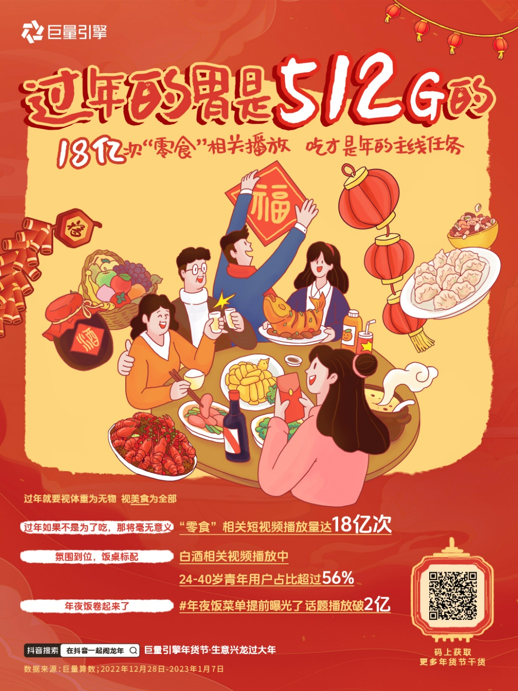 “新场景”在浓重的节日氛围下随之而来,春节饮食日渐多元化。在一年中最重要的节日里,从年夜饭桌到休闲零食,各类餐食琳琅满目,成为家庭聚会、亲友聚餐时不可或缺的元素。抖音将年轻人群在春节里海纳百川的胃口形容为“512G”的超大容量,在节日里放开嗨吃,是他们对过年的另一种“热爱”表达。据数据统计,年货节期间,“零食”相关短视频播放量高达18亿次。