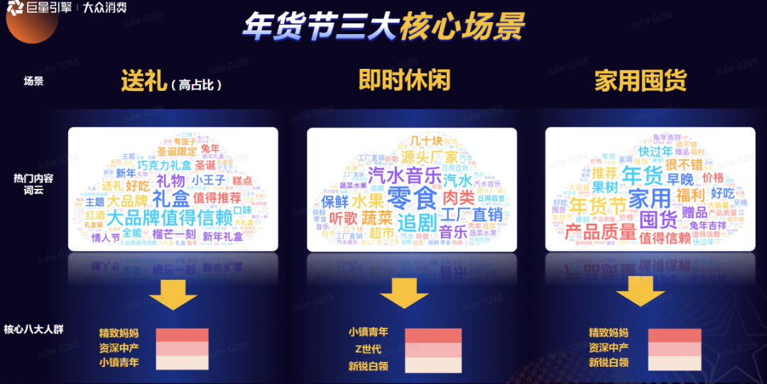 对商家而言,在把握春节消费基本趋势的基础上,将自身货品与消费场景绑定,激发消费欲望,则是获得生意增长的重要策略。巨量引擎总结年货节消费的三大核心场景——送礼、即时休闲、家用囤货,指引商家制定科学组货方式,抓住年货节生意增长机遇。