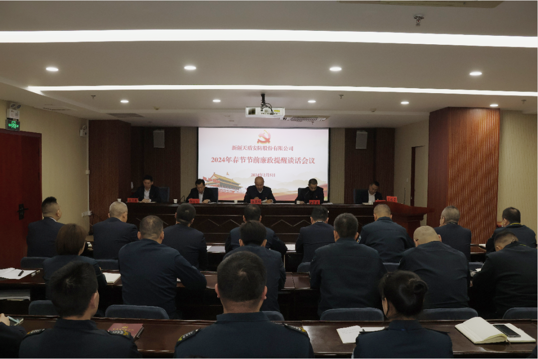 2024年春节将至,为严防“四风”问题反弹回潮,锲而不舍落实中央八项规定精神,着力营造欢乐祥和、风清气正的节日氛围,2月5日,新疆天盾安防股份有限公司召开春节前廉政提醒谈话暨春节及“两会”期间安全生产工作部署会。会议由党委副书记、常务副总经理徐昊旻主持,公司领导、主管级及以上管理人员参加会议。