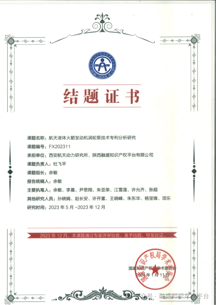 近日,由国家知识产权运营(陕西)先进技术转化平台建设主体陕西融盛知识产权平台有限公司联合西安航天动力研究所承担的2023年度国家知识产权局专利专项研究项目——航天液体火箭发动机涡轮泵技术专利分析项目顺利验收结题。