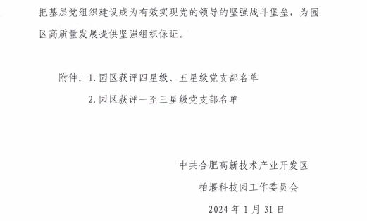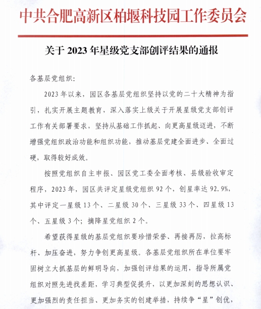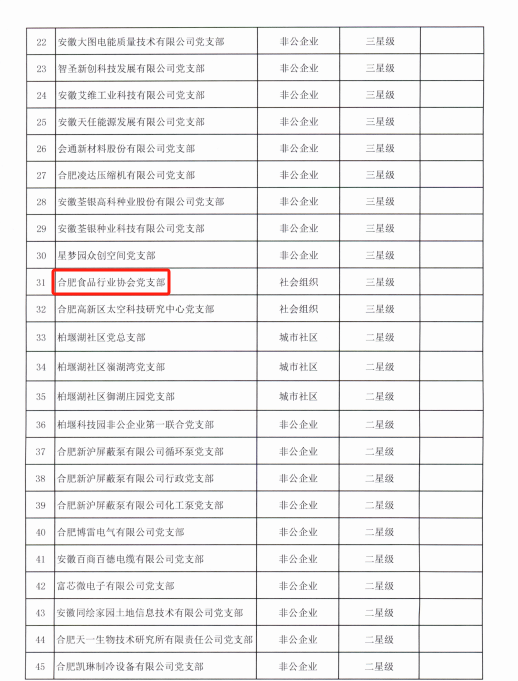 1月31日,中共合肥高新技术产业开发区柏堰科技园工作委员会发布《关于2023年星级党支部创评结果的通报》,合肥市食品行业协会党支部获评年度“三星级党组织”。