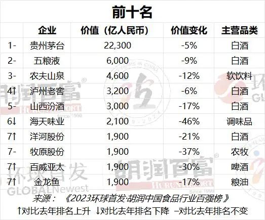 榜单前三甲也有不同程度的价值下滑,其中,贵州茅台虽以2.2万亿价值蝉联中国食品行业最具价值企业,但较去年同期下降5%;五粮液以6000亿元位居第二,但价值下跌9%;首富钟睒睒的农夫山泉以4600亿元价值位居前三,价值下降12%。