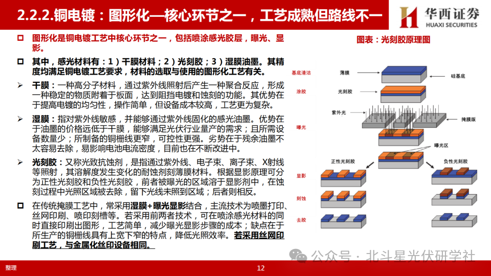光刻胶:又称光致抗蚀剂,是指通过紫外线、电子束、离子束、X射线 等照射,其溶解度发生变化的耐蚀剂刻薄膜材料。根据显影原理可分 为正性光刻胶和负性光刻胶,前者被曝光的区域溶于显影剂中,在蚀 刻过程中光照区域被去除,留下光线未照到区域;后者则相反。在传统掩膜工艺中,常采用湿膜+曝光显影结合,主流技术为喷墨打印、 丝网印刷、喷印刻槽等。若采用前两者技术,可在喷涂感光材料的同 时直接印刷出图形,工艺简单,减少曝光显影步骤的成本;缺点在于 所生产的铜栅线具有上宽下窄的特点,降低光照效率。若采用丝网印 刷工艺,与金属化丝印设备相同。