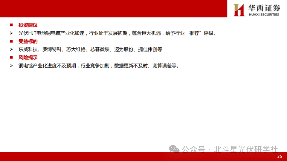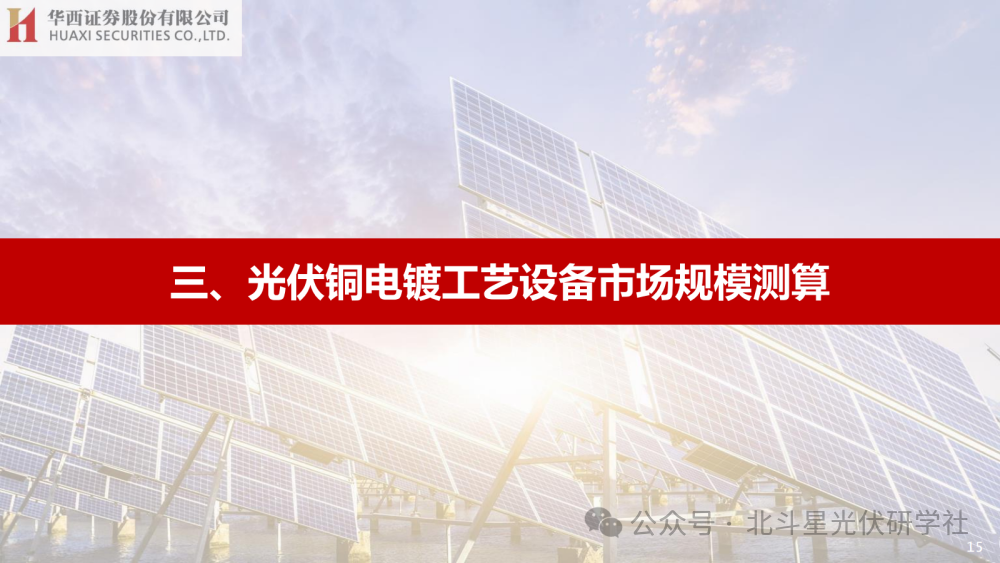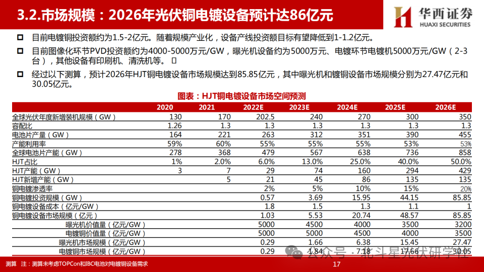 目前电镀铜投资额约为1.5-2亿元。随着规模产业化,设备产线投资额目标有望降低到1-1.2亿元。目前图像化环节PVD投资额约为4000-5000万元/GW,曝光机设备约为5000万元、电镀环节电镀机5000万元/GW(2-3 台),其他设备有印刷机、清洗机等。️ 经过以下测算,预计2026年HJT铜电镀设备市场规模达到85.85亿元,其中曝光机和镀铜设备市场规模分别为27.47亿元和 30.05亿元。