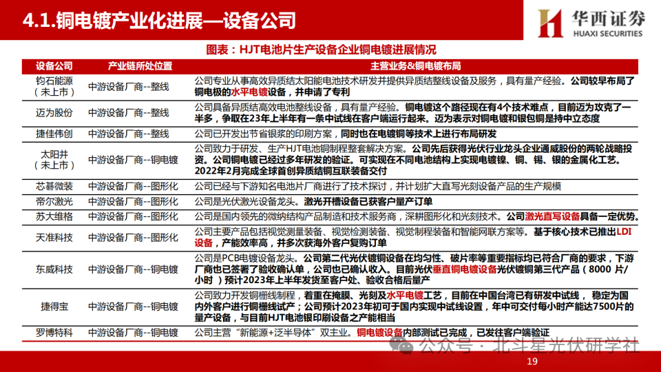 电镀铜环节仍存技术难点待突破,设备厂商加快布局:电镀方式主要有垂直升降式电镀、垂直连续电镀及水平电镀等。其中,垂直电镀工艺 更为成熟,但效率或存在瓶颈;水平电镀容易实现自动化但目前镀铜均匀性较差。电镀设备厂商主要有东威科技、捷得宝、罗博特科、钧石 能源等。其中,东威科技已实现8000片/小时光伏垂直镀铜设备研发;罗博特科已完成设备内测,已发往客户端验证;钧石能源、太阳井、捷 德宝电镀设备也在推进中。