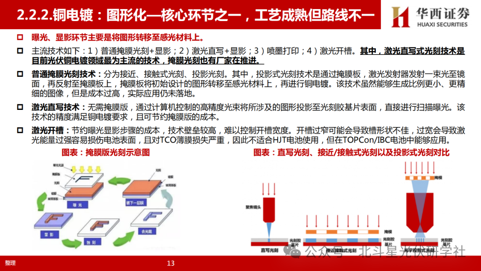 激光直写技术:无需掩膜版,通过计算机控制的高精度光束将所涉及的图形投影至光刻胶基片表面,直接进行扫描曝光。该 技术的精度满足铜电镀要求,且可节约掩膜版的成本。激光开槽:节约曝光显影步骤的成本,技术壁垒较高,难以控制开槽宽度。开槽过窄可能会导致槽形状不佳,过宽会导致激 光能量过强容易损伤电池表面,且对TCO薄膜损失严重,因此不适合HJT电池使用,但在TOPCon/IBC电池中能够应用。
