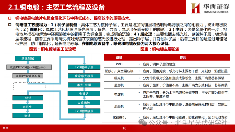 铜电镀是电池片电极金属化环节中降低成本、提高效率的重要技术。铜电镀工艺流程为:1)种子层制备:具体工艺为镀种子层,主要是增加铜镀层和透明导电薄膜之间的附着力,防止电极脱 落;2)图形化:具体工艺包括喷涂感光胶层,曝光、显影,显现出在感光胶上的图形;3)电镀:这是金属化的一步,将 电池片插在电解池中还原溶液中的铜离子为铜金属,完成铜的沉淀;4)后处理:主要包括去感光胶、刻蚀种子层,镀焊接 层等流程,前者主要采用清洗机对残留在表面的感光胶进行处理,露出种子层,并刻蚀种子层;后者主要目的是通过电镀锡 保护层,防止铜氧化,延长电池寿命。在铜电镀设备中,曝光和电镀设备为两大核心设备。