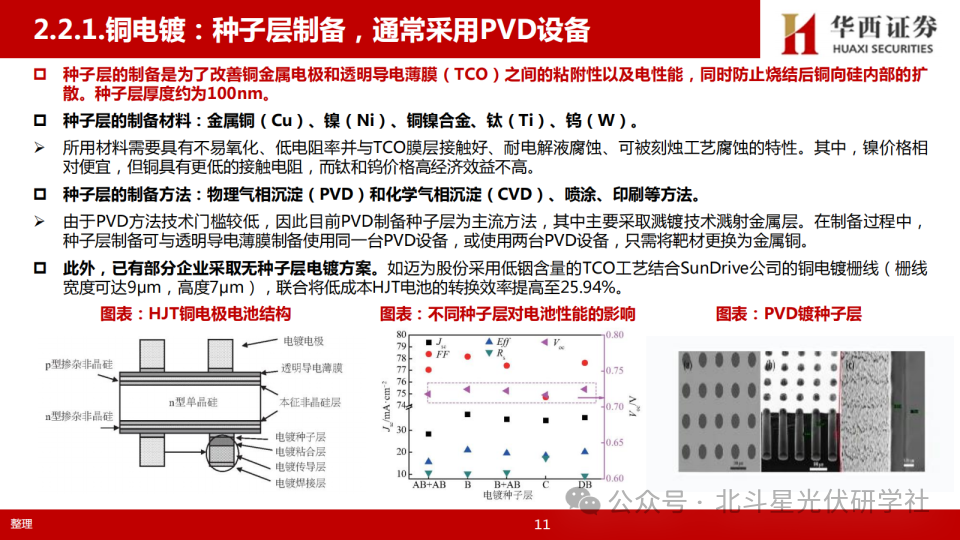 种子层的制备方法:物理气相沉淀(PVD)和化学气相沉淀(CVD)、喷涂、印刷等方法。由于PVD方法技术门槛较低,因此目前PVD制备种子层为主流方法,其中主要采取溅镀技术溅射金属层。在制备过程中, 种子层制备可与透明导电薄膜制备使用同一台PVD设备,或使用两台PVD设备,只需将靶材更换为金属铜。此外,已有部分企业采取无种子层电镀方案。如迈为股份采用低铟含量的TCO工艺结合SunDrive公司的铜电镀栅线(栅线 宽度可达9μm,高度7μm),联合将低成本HJT电池的转换效率提高至25.94%。