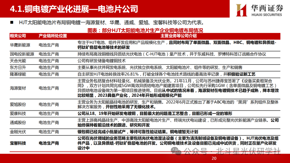 去银化趋势下,铜电镀工艺优势凸显。电镀优势在于成本低、电池接触性能高、电池损耗率低、不易氧化等。根据我们测算:1)丝印HJT非硅成本约0.31元/W,比PERC非硅成本 高出0. 07元/W,电镀HJT为0.23元/W,已经基本和PERC打平。2)银耗量方面,丝印HJT电池达到0.152元/W,显著高于PERC电池0.06元 /W和TOPCon电池0.08元/W的水平,而铜电镀HJT电池浆料及其他材料成本约0.05元/W。若铜电镀量产,我们认为单瓦成本仍有进一步降 低的空间:1)设备中长期来看有降本空间,降低折旧成本;2)药剂、油墨等材料也有下降空间。3)薄片化降低硅片成本。