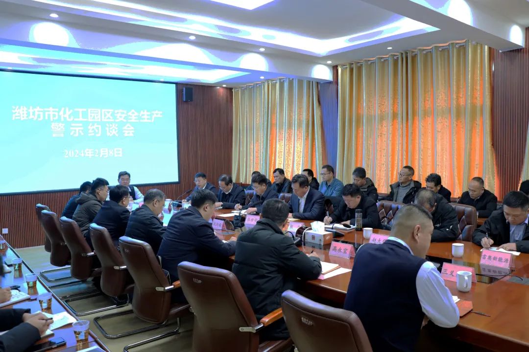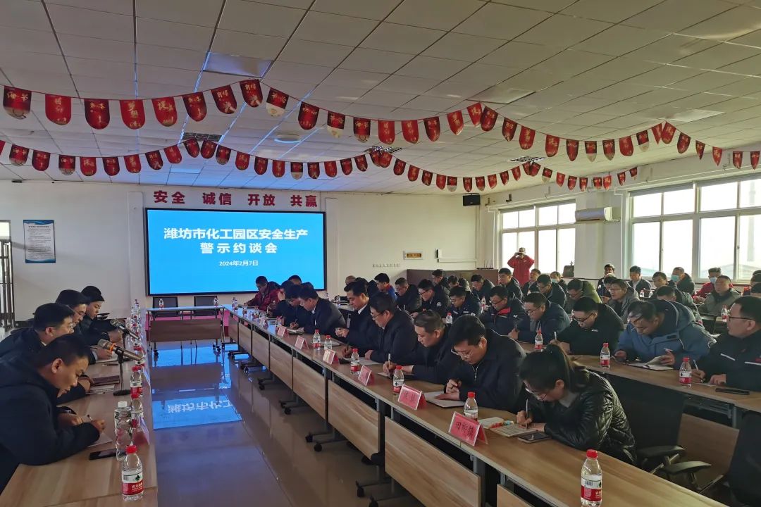 为深入学习贯彻习近平总书记关于安全生产重要指示批示精神,落实市委市政府部署要求,进一步压实各级各单位安全生产责任,切实做好春节期间安全生产工作,2月7日至2月8日,潍坊市应急局深入各化工园区召开安全生产警示约谈会,面对面交流座谈,督促各级各单位切实提高思想认识,拧紧安全责任弦,全力抓好当前各项重点任务,守牢节日期间安全生产防线。市应急局党委书记、局长王法顺出席会议并讲话,省专班督导组、县市区政府、化工园区相关负责人和危化品企业主要负责人参加会议。