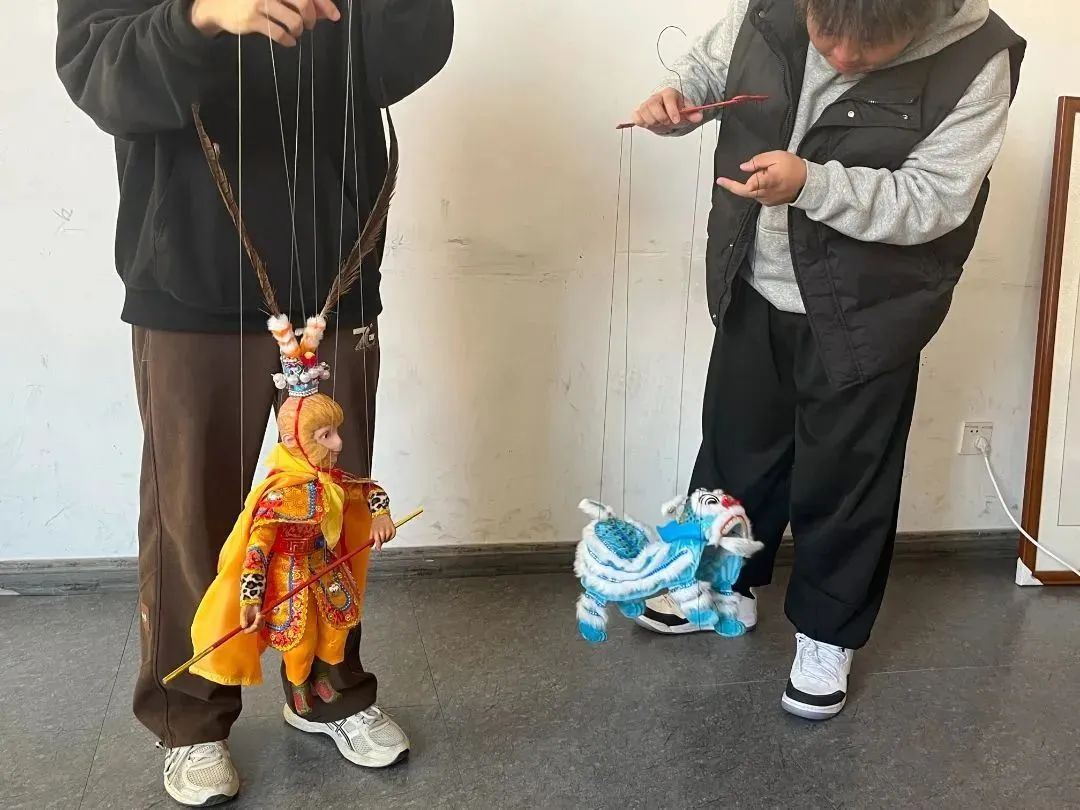 随后,老师指导成员们操作提线木偶。在一根根银线的牵引下,木偶显得栩栩如生,成员们体验的是最基础的七八根线的木偶戏,学习起来却还是略显艰难,泉州提线木偶一般有16根以上提线,有些木偶多达30多根提线,线条愈多,操作愈复杂,需要的技巧表演难度也最高。这让我们对传统工艺传承人充满敬佩。