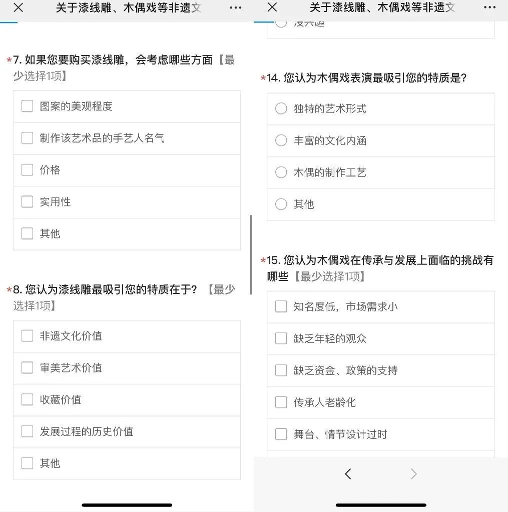 为更好宣传漆线雕、木偶戏等闽南传统工艺,实践团制作了一份关于漆线雕、木偶戏的问卷,并在学生群体中进行广泛调查,尝试探索一些创新方案,希望团队能在宣传传统工艺方面尽绵薄之力。