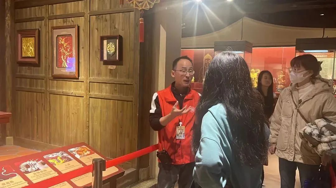 随后,成员们对讲解员进行了简单访谈。在谈到关于传统工艺的传承中,讲解员认为不能只要求传统手工艺人进行传承创新,更重要的是,要提高传统工艺的知名度,让世界知道何为漆线雕,何为木偶戏,使大家主动了解并传承传统工艺。讲解员的话语给我们带来了很多的思考与启发,为我们指明了努力方向。