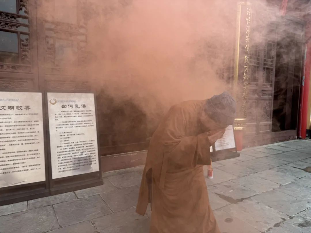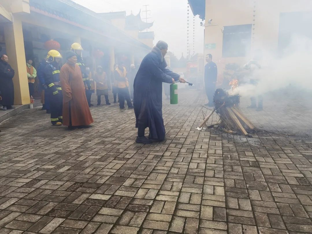 安全出口是发生火灾后的“生命通道”,杨队长边带领大家在大殿进行实战疏散演练,边讲解烟雾逃生和使用灭火器的正确方法。杨队长说:“一般来说,火灾发生时都伴有浓烟,这些大量的火光浓烟,即使是很熟悉的环境,也会变得非常昏暗,这时候一定要冷静下来,了解清楚自己处在什么位置,具体是怎样一个建筑结构,方便自己进行逃生。火灾烧出时的烟气是往上飘的,看到烟雾的时候,要俯下身子以低姿态通过,然后用打湿的毛巾捂住口鼻,避免烟雾进入灼伤呼吸道。”