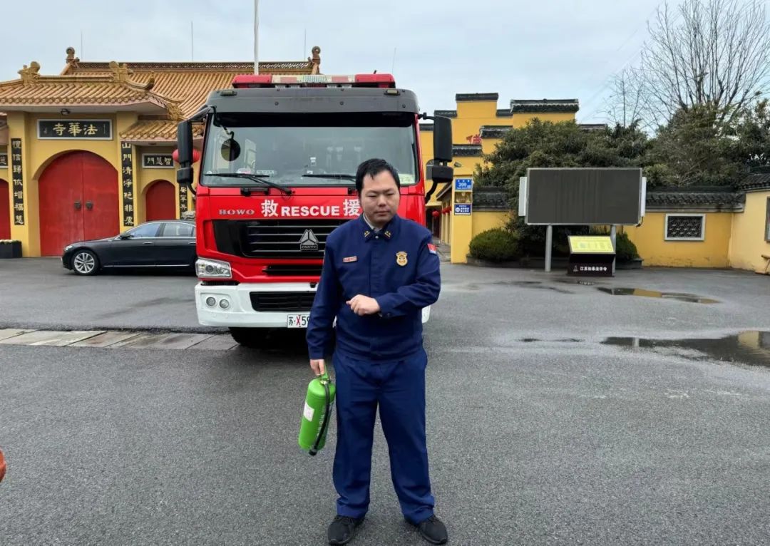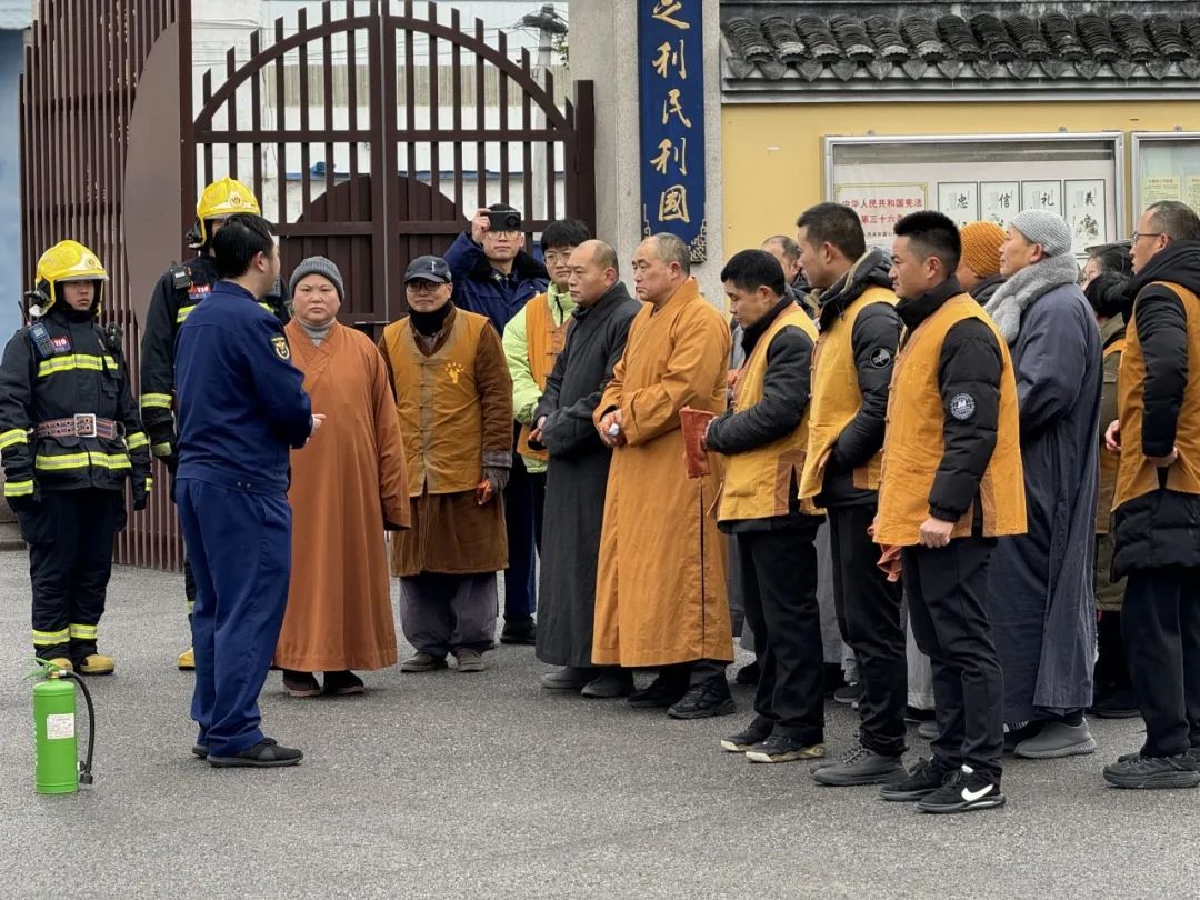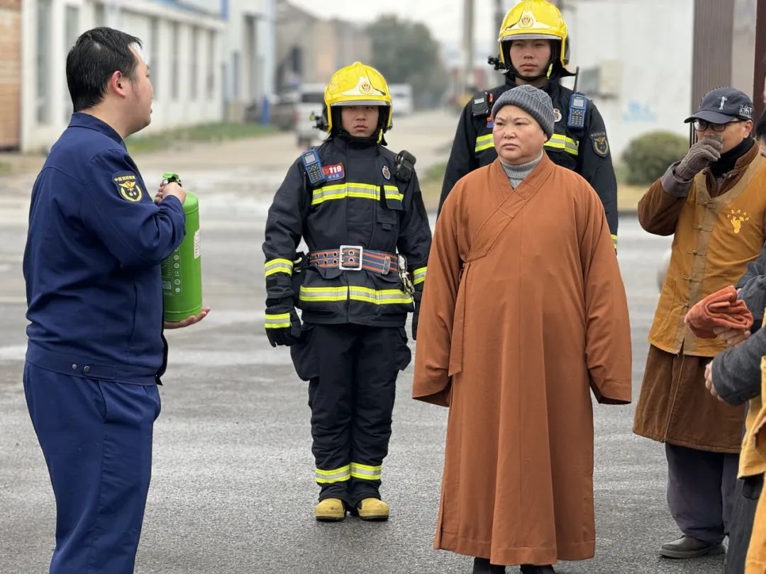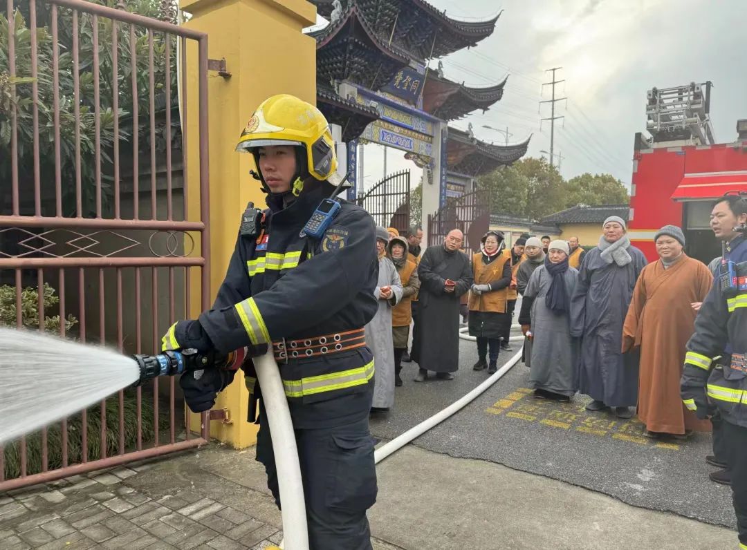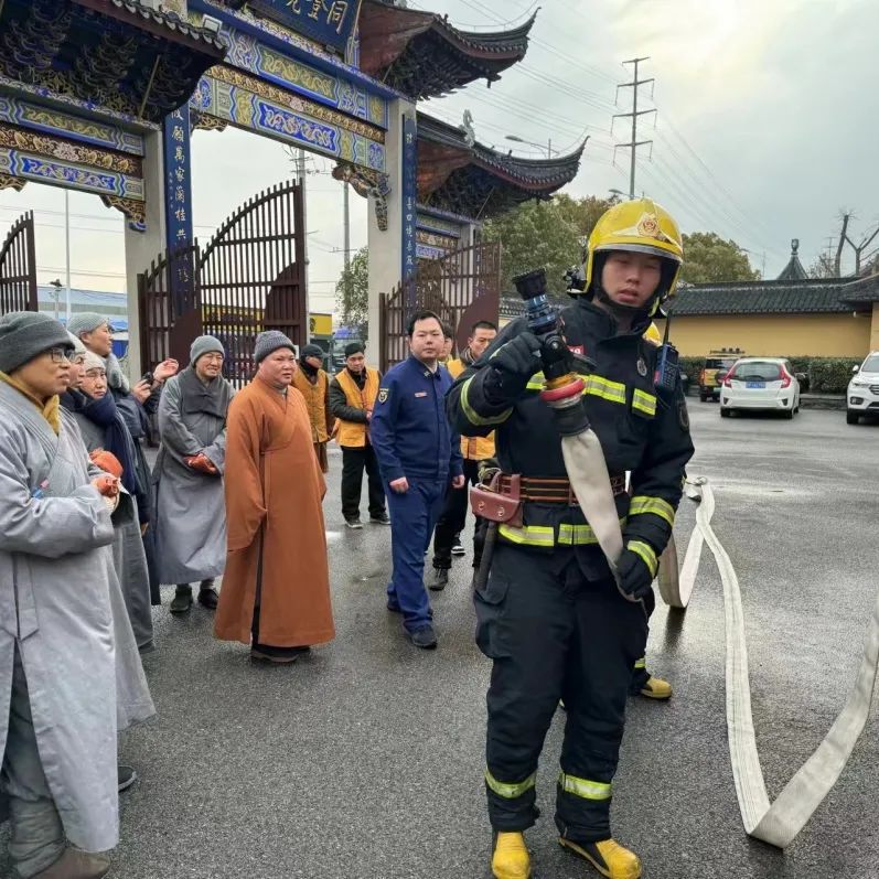 2024年2月5日上午,春雪融融,寒气逼人。法华寺内却是热火朝天,一场堪称教科书级别的消防演习正式拉练。指挥这次消防演练的,是如皋消防救援大队的杨震宇队长。别看他中等身材,却是消防救援的行家里手。有他现场指挥,一切按部就班,井然有序。参加此次消防演练的有法华寺、三里塔寺的法师和法华寺救援队突击队的义务消防员。