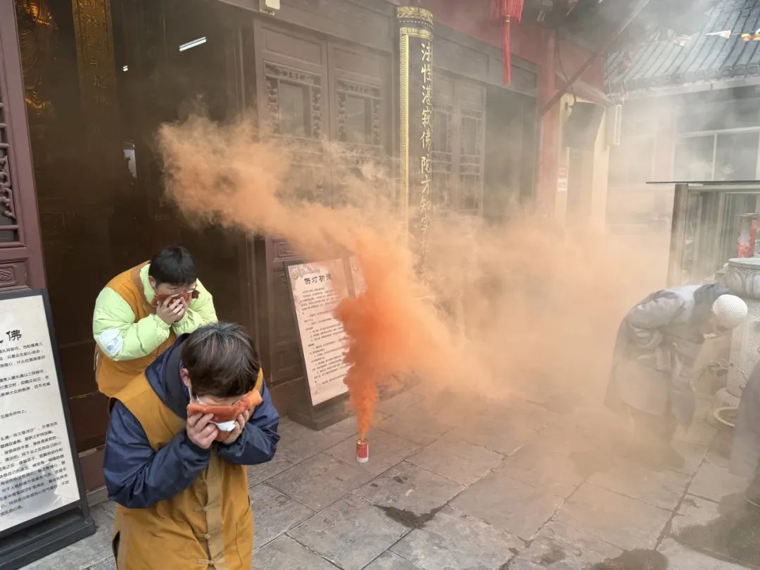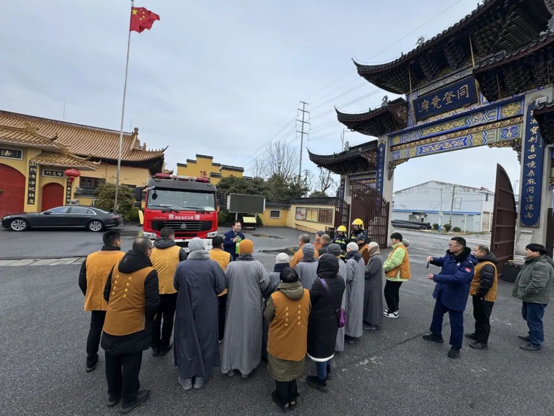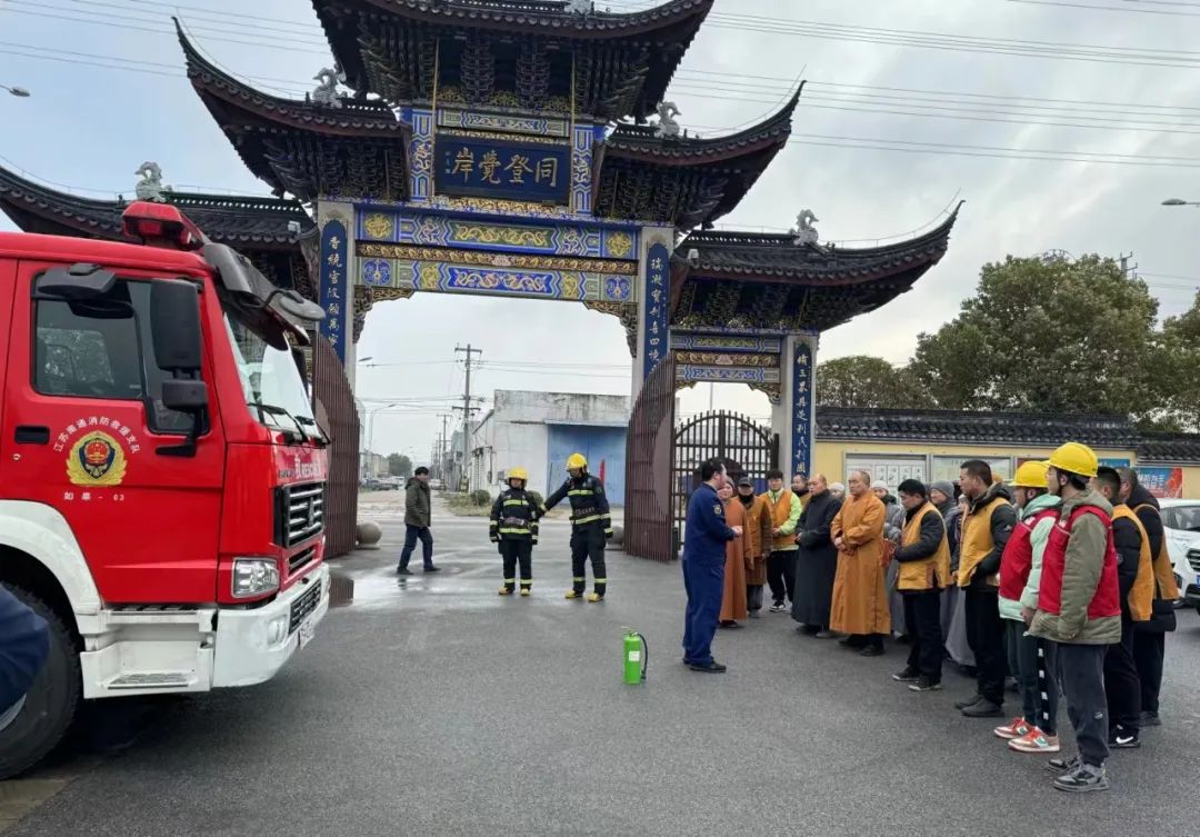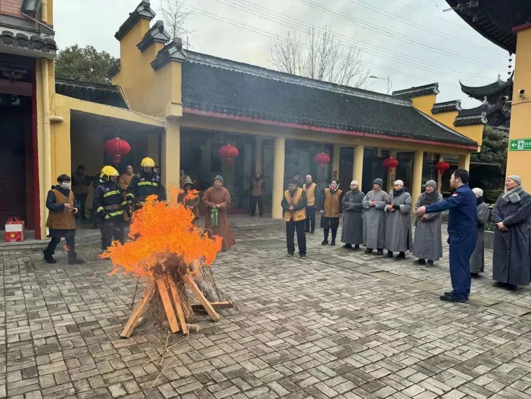 2024年2月5日上午,春雪融融,寒气逼人。法华寺内却是热火朝天,一场堪称教科书级别的消防演习正式拉练。指挥这次消防演练的,是如皋消防救援大队的杨震宇队长。别看他中等身材,却是消防救援的行家里手。有他现场指挥,一切按部就班,井然有序。参加此次消防演练的有法华寺、三里塔寺的法师和法华寺救援队突击队的义务消防员。