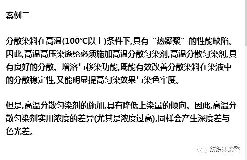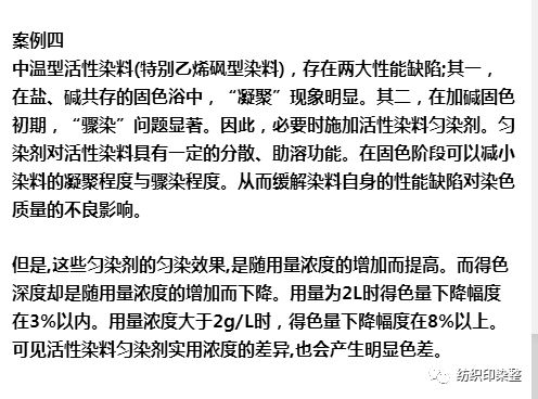 可见,染色助剂的施加,有一个“度”的问题。即施加量过“度”低,实用效果差,施加量过“度”高,又会给染色结果造成不可低估的负面影响。因此,施加染色助剂,务必注意两点: