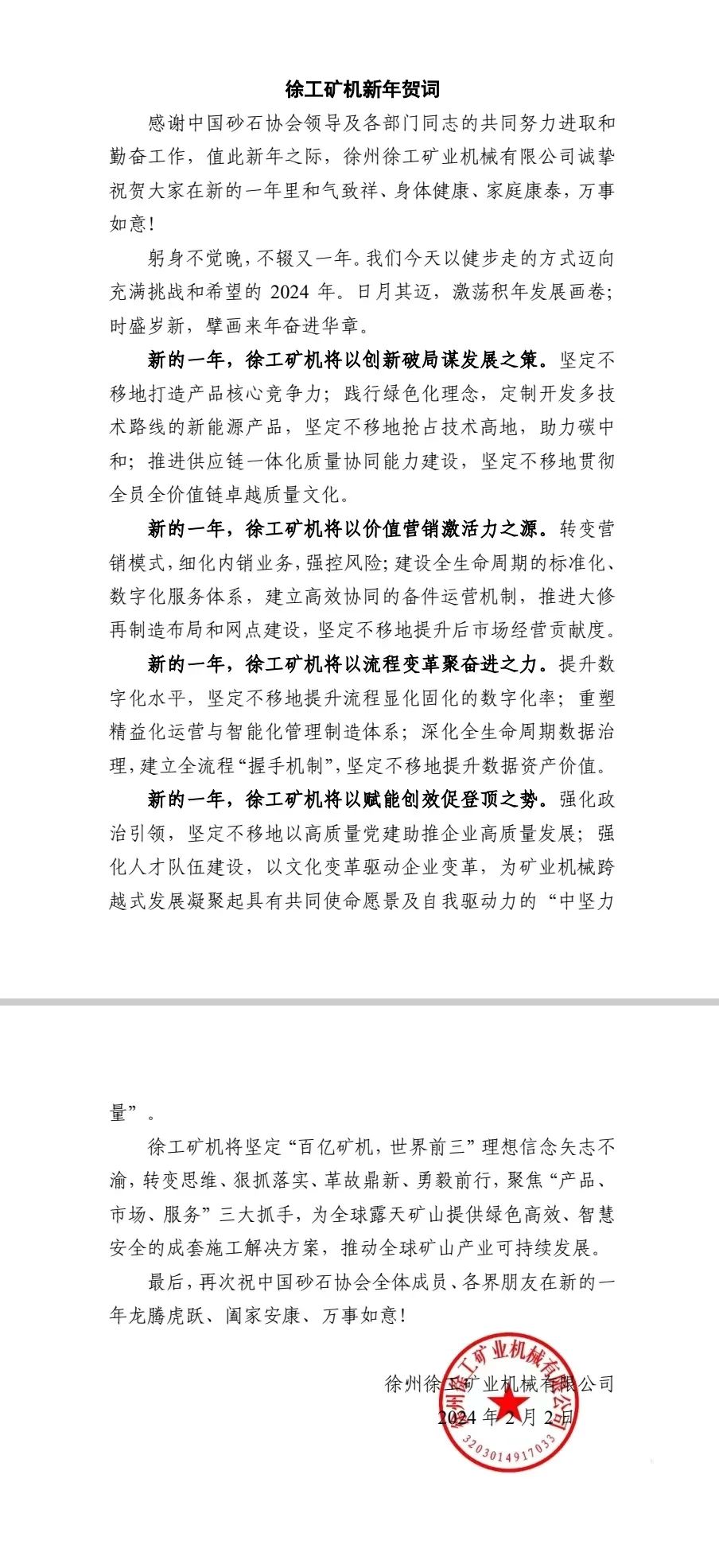 中国砂石协会收到徐州徐工矿业机械有限公司向中国砂石协会发来新年贺词,协会对此感到十分荣幸。新的一年中国砂石协会一如既往做好“四个服务”,持续构建企业和政府之间的桥梁纽带,及时反馈企业心声和行业行情,推动行业绿色低碳、健康有序高质量发展》