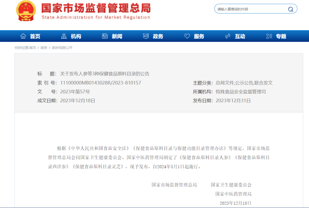 日前,国家市场监督管理总局、国家卫生健康委、国家中医药管理局联合印发《关于发布人参等3种保健食品原料目录的公告》(以下简称《公告》),将灵芝、人参、西洋参纳入保健食品原料目录,并明确其用量范围、适宜人群、不适宜人群、功效和注意事项。