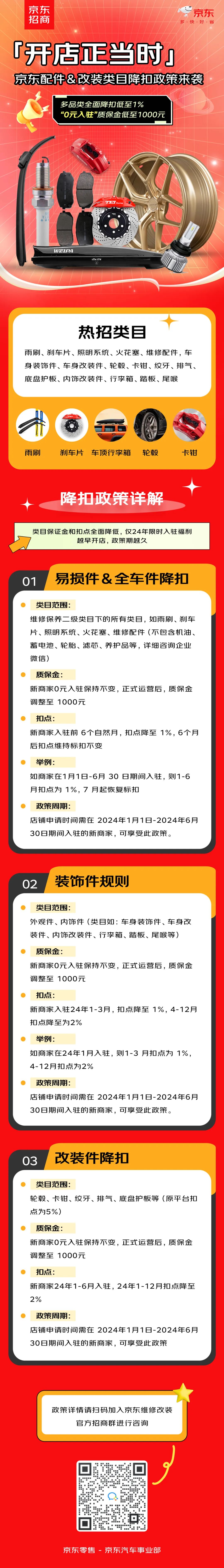 您好,由于业务发展规划,鼓励SOP商家在京东积极经营汽车配件及改装相关业务品类,实现商品丰富度快速增长,同时助力新商家运营成本优化,建立价格竞争力,提升店铺转化能力。京东汽车维修改装业务部开展相关品类的新商家入驻及降扣政策,具体政策内容如下:POP-SOP模式店铺(仅支持SOP且非全球购类型) 店铺归属汽车事业部。1、新商家入驻周期:2024年1月1日至2024年6月30日;2、降扣政策:2024年新商家类目扣点最低降至1%,2024年新商家降扣时间最长为2024年全年(具体参考下方表格明细),2024年新商家质保金低至1000元;3、适用品类:雨刷、刹车片、照明系统、火花塞、维修配件,车身装饰件、汽车包围、车身改装件、轮毂、卡钳、绞牙、排气、底盘护板、内饰改装件、车顶行李箱/架、汽车踏板、尾喉、电尾门、电吸门、无钥匙进入、车窗升降器等63个类目;招商政策详情可入群对接品类专属招商人员进行咨询,入群方式扫描下方二维码。