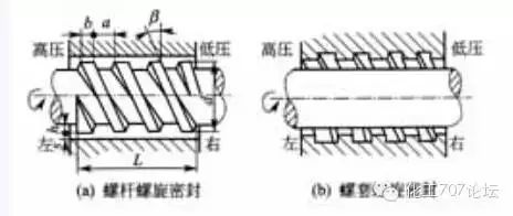 螺旋密封也是动力密封的一种形式,它是在旋转的轴上或者在轴的包容套上加工出螺旋槽,轴和套之间充有密封介质。轴的旋转使螺旋槽产生类似于泵的输送作用,从而阻止密封液的泄漏。其密封能力的大小与螺旋角度、螺距、齿宽、齿高、齿的作用长度以及轴与套之间的间隙大小有关。