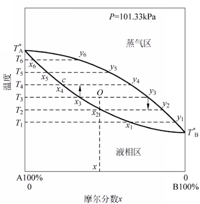 如下图所示,B组分沸点低,A组分沸点高,两条曲线表示在不同温度下蒸汽中A与B的摩尔分数,各虚线表示分馏柱内各塔板中的温度,随温度逐渐降低(图中向下),B组分的含量逐渐增大,而A逐渐减小,最终得到纯的B组分。