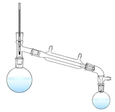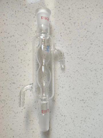 直形冷凝管用于在蒸馏液体化合物时(分离沸点相差较大的液体混合物)冷凝蒸气使用。与蒸馏头、圆底烧瓶、单股接引管等搭配,可以组成液体蒸馏装置。由于蒸汽与管壁接触面积相对较小,一般不用于冷凝回流。蒸馏过程中为了判断馏分的组成成分,需要测量蒸汽的温度。为保证测量的准确性,温度计水银球的上限应该与蒸馏头支管口的下沿在同一水平线上。蒸馏时在烧瓶中应当加入2-3粒沸石,多孔的沸石可以起到气化中心的作用,防止暴沸。加热至液体沸腾,控制蒸馏速度1-2滴每秒为宜。达到待分离组分沸点之前的流出液称为馏头,应当作为杂质舍弃。无论是直形冷凝管还是球形、蛇形冷凝管,冷凝水都应该从下口进,上口出,以达到最好的冷凝效果。