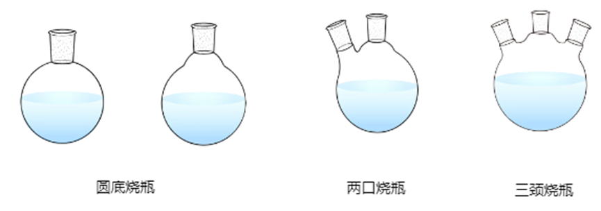 烧瓶是有机化学实验中最常用的反应、回流装置,可以直接在电热套上加热。最常见的是只有一个出口的圆底烧瓶,其出口处可以安装蒸馏头、球形冷凝管等,用于蒸馏提纯和反应容器,也可以作为蒸馏装置的接收瓶。如果反应体系中同时需要多种操作,可以使用两口烧瓶或三颈烧瓶,它们的多个出口可以分别接上冷凝管、温度计、恒压滴液漏斗等,用于一边加热回流、一边加入反应物,或同时需要测量温度的情况。