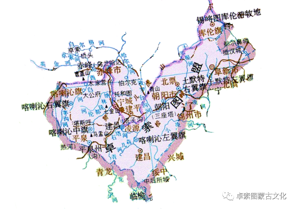 昔日的卓索图盟,包括喀喇沁三旗和土默特二旗,另附锡勒图库伦札萨克、喀尔喀闲散多罗贝勒(也称唐古特喀尔喀旗,康熙元年即1662年由杭爱山来归,康熙四年即1665年封多罗贝勒)二部。前者是喇嘛旗,和后者共同游牧于土默特左翼旗境内,与土默特左旗同进出,故一般不单列。位于今辽宁省西部、河北省东北部、内蒙古自治区东南部。地域包括今辽宁省的阜新、北票、朝阳、喀左、凌源、建昌等市县,建平县南部地带;河北省的平泉;内蒙古的赤峰喀喇沁旗、宁城,通辽市库伦旗等市县。