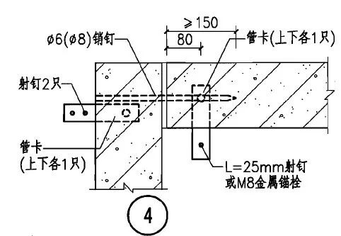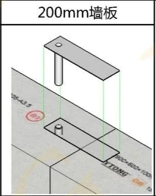 4)隔墙板转角或T型连接应用φ6销钉固定。销钉位置宜距隔墙顶和底各300~400。销钉间距为700左右。销钉锚入两块不同方向板材的总深度不得小于一块板厚再加150mm。