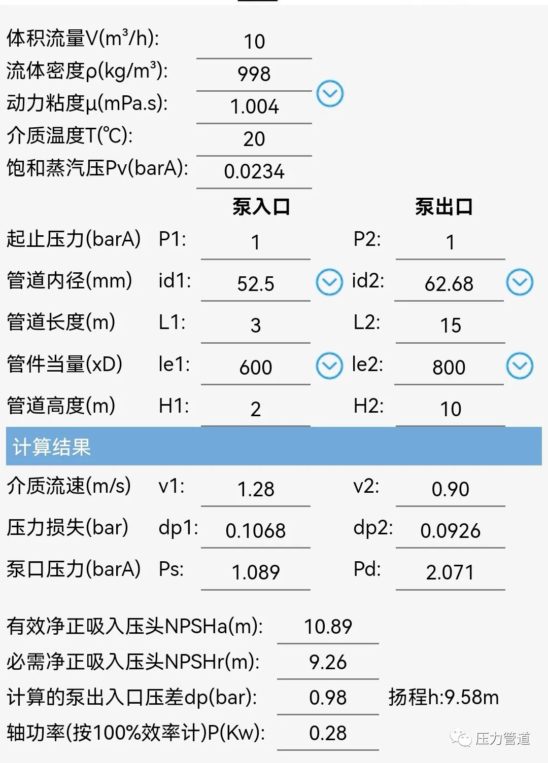 管道随手小程序计算扬程和功率
