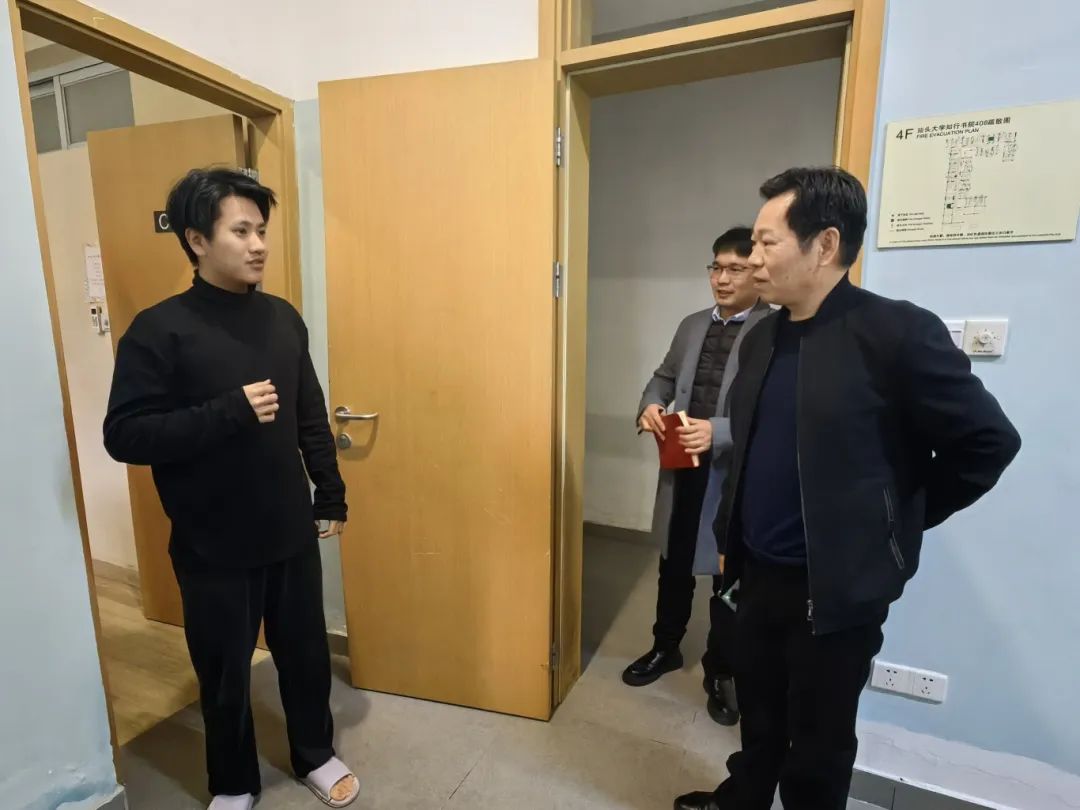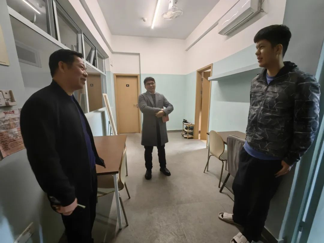 1月22日,方奕文带领学院学工团队走访了寒假留校学生宿舍,仔细查看宿舍各项设施,关心同学们的留校需求,排查宿舍安全隐患,提醒学生高度重视安全问题,并向同学们送去关怀和问候。