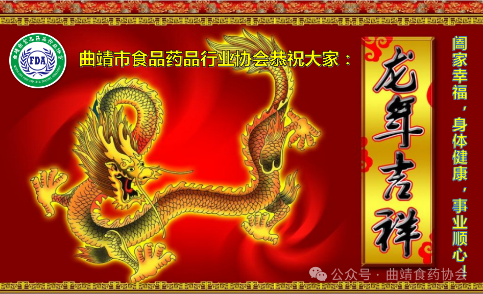 值此2024年新春佳节,曲靖市食品药品行业协会谨向全体会员单位、广大食药从业人员以及长期关心支持全市食药行业发展的各级领导和社会各界朋友,致以新春的问候和最诚挚的祝福。