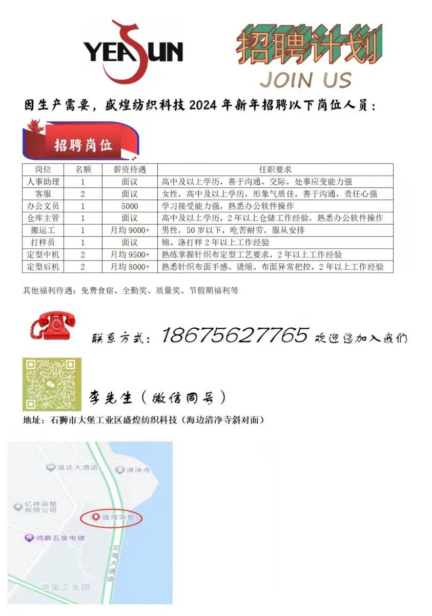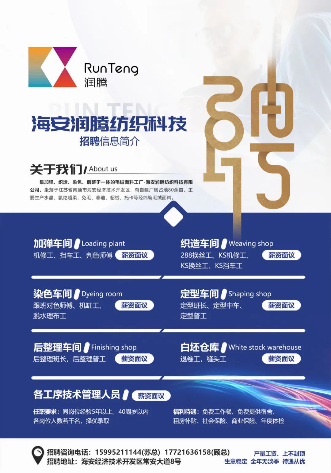 2/6 招聘:染厂厂长 主要产品梭织布和经编,工作地点:南通海安,薪资待遇:面议,联系电话:17706258585(微信号:472083062)