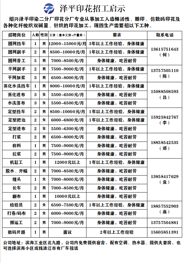 1,染色操作工,熟手优先,40岁以下学徒亦可,2人