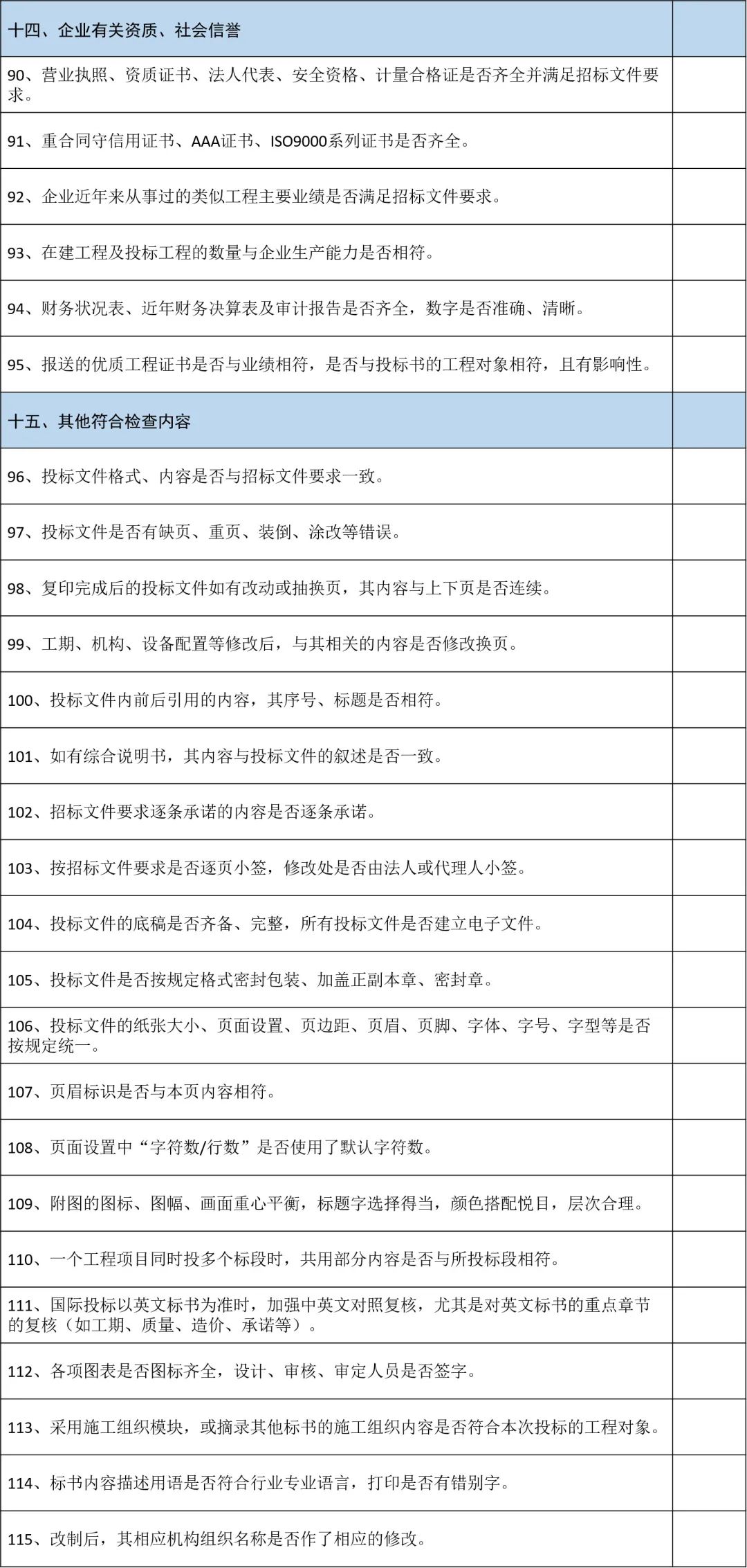 下面这一套核查表格,涵盖了投标文件容易出错的115处“雷区”,投标文件编制好后按此表格进行核查,能够避免废标的产生。