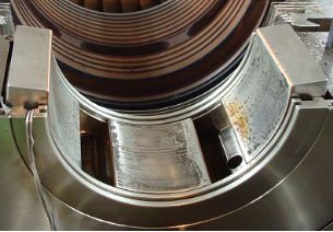 某燃料气压缩机机组GB351,在解体增速器时发现高速轴径向轴瓦烧毁严重,如图,经分析和验证轴瓦损坏的原因是轴承间隙过小。