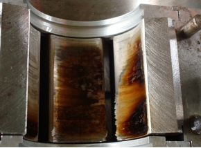 某氮压缩机机组时发现蒸汽透平径向轴瓦疲劳损坏,如图,经分析和验证轴瓦损坏的原因是轴承间隙过大。