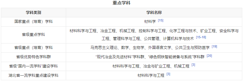 截至2023年12月,学校拥有8个博士后科研流动站,8个一级学科博士学位授权点和40个二级学科博士学位授权点、33个一级学科硕士学位授权点和174个二级学科硕士学位授权点、20个硕士专业学位类别。建有1个国家重点(培育)学科、1个“十四五”教育部优先发展学科、10个省级重点学科,5个省级重点(培育)学科,6个省级优势特色学科群。材料科学与工程、冶金与矿业工程、机械工程等3个学科入选湖北省“国内一流学科”建设学科;材料科学与工程学科入选湖北省一流学科重点建设学科。