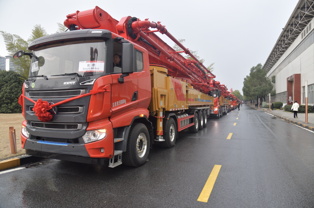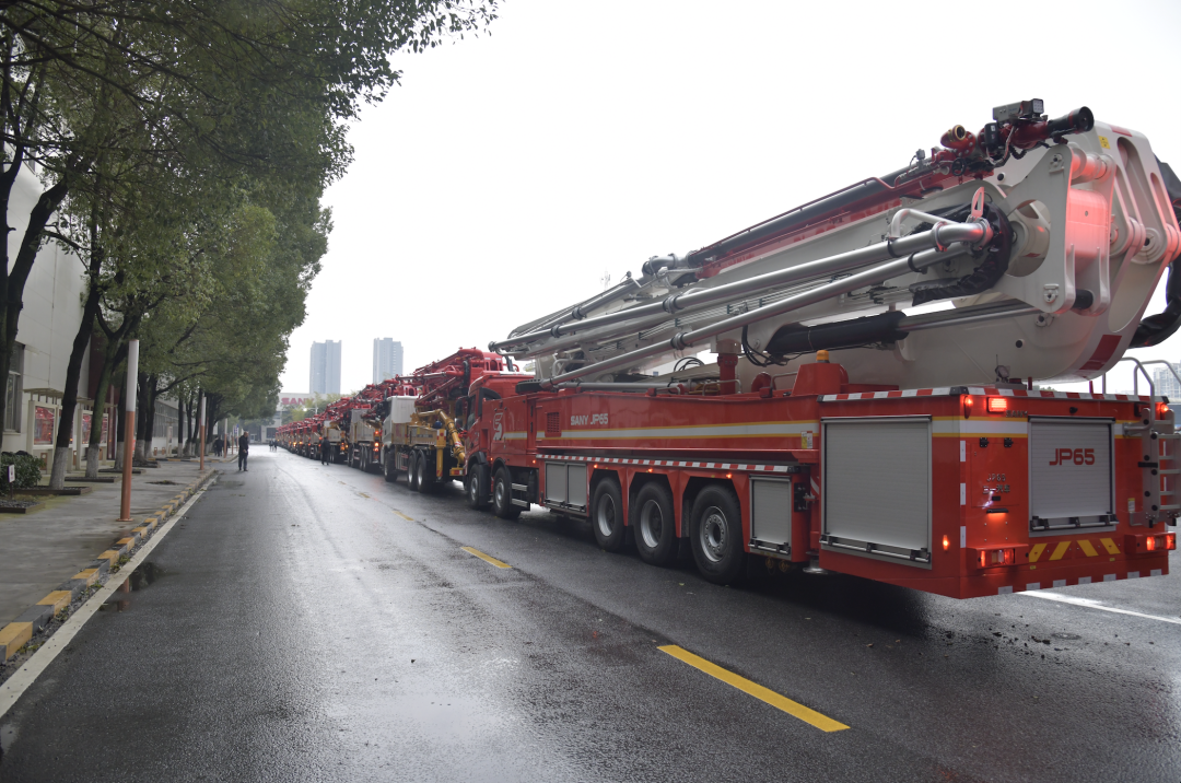 长沙园区的主干道上,准备发往沙特、菲律宾、越南等11个国家的泵车产品一字排开。