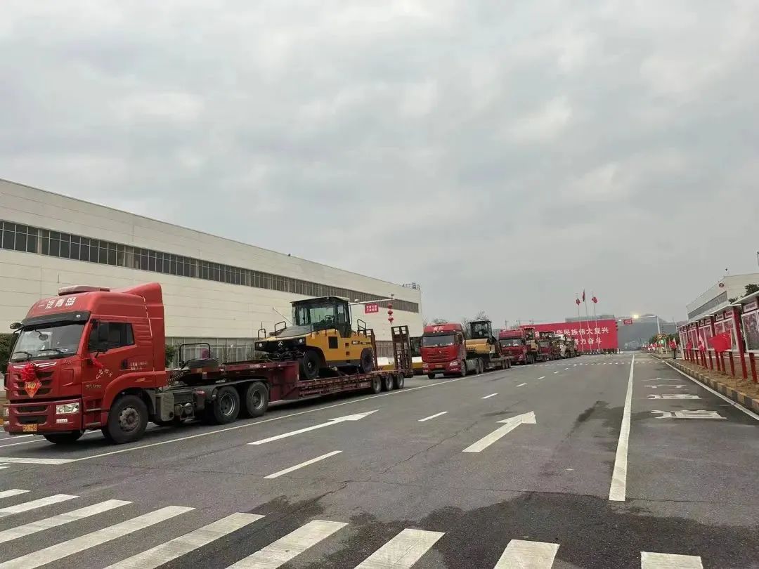 在涟源产业园,准备交付的三一压路机装满了长长的一列平板车队。