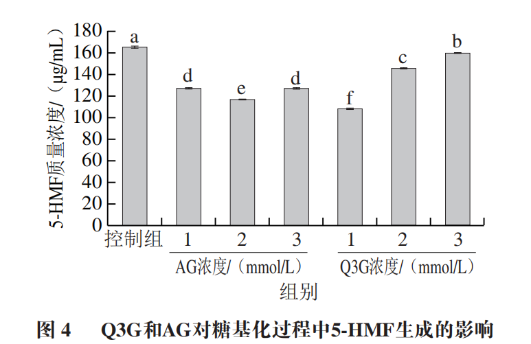 5-HMF是还原糖通过异构和脱水产生的呋喃化合物,是糖基化反应中期的标志性产物,如图4所示,添加1、2、3 mmol/L的Q3G后,体系中5-HMF质量浓度由165.28 μg/mL降至111.64、145.09 μg/mL和158.34 μg/mL;添加1 mmol/L Q3G的α-La-果糖糖基化体系中5-HMF含量最低,显著低于相同添加量的AG(116.26 μg/mL)。然而,随着Q3G浓度的升高,5-HMF含量呈现升高的趋势。当Q3G浓度低于2 mmol/L时,其能显著减少5-HMF的形成。此外,前期研究发现,当Q3G浓度为36.58 μmol/L时,其对AGEs的抑制率可达74.66%,表明Q3G能显著延缓晚期糖基化反应的进行,造成中期产物如5-HMF等的积累。