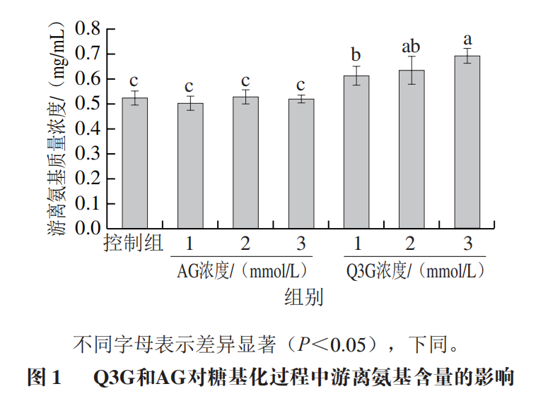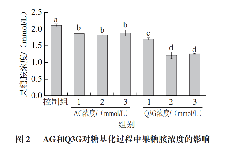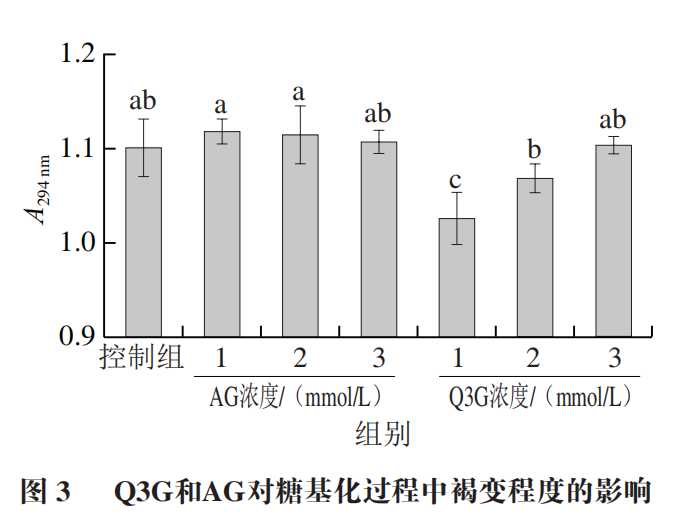 糖基化反应初期产物进一步裂解氧化,产生一系列小分子,这些小分子是褐色色素形成的主要前体物质,通过测定294 nm波长处的吸光度反映其含量,并体现样品褐变程度。如图3所示,控制组、添加1、2 mmol/L和3 mmol/L Q3G实验组的吸光度分别为1.1、1.026、1.096、1.104,Q3G的添加改变了反应体系在294 nm波长处的吸光度,含1 mmol/L Q3G实验组效果最好,其吸光度显著低于控制组;含3 mmol/L Q3G实验组的吸光度与控制组和3 mmol/L AG组(1.107)无显著差异。以上结果说明Q3G显著抑制了糖基化导致的褐变,这可能是由于Q3G通过自由基清除活性减缓了初期产物的氧化裂解。