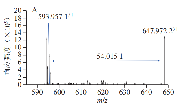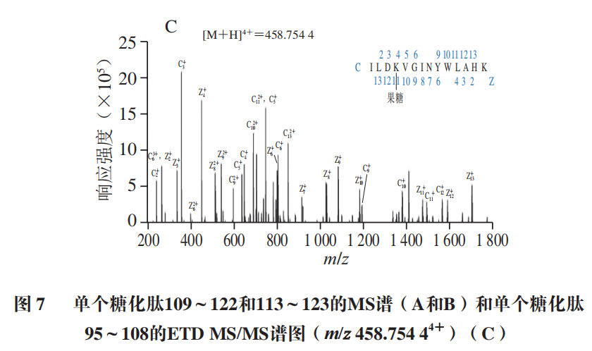 为更好地阐明Q3G对α-La-果糖糖基化的抑制机制,采用UPLC-Q-Orbitrap MS/MS技术研究Q3G对α-La糖基化位点的影响。糖化的多肽可通过对比其糖化前后的质量偏移进行确定。Lys、Arg和N末端的氨基是蛋白质的潜在糖化位点,而胰酶不会破坏Lys、Arg的糖基化修饰,因此,将C系列和Z系列离子与已发现的蛋白质组中记录的离子匹配可对糖基化位点进行表征。果糖相对分子质量为180,当一分子果糖连接到Lys上时,C(n)和C(n-1)之间或Z(m-n)和Z(m-n+1)之间的质量偏移为162+128,而Arg为162+156(其中m为特定肽段中氨基酸残基的数目,n为Lys/Arg的位置)。当多肽所带电荷为+1、+2、+3、+4时,单糖基化肽段质荷比(Δm/z)分别增加162.0528、81.0264、54.0176和40.5132;而双糖基化肽段m/z分别增加324.1056、162.0528、108.0352和81.0264。如图7A、B所示,未糖基化肽段109~122(ALCSEKLDQWLCEK)和115~123(LDQWLCEKL)的m/z峰值分别为593.95713+和602.80592+,糖化之后其m/z分别增加了54.0116和81.0263,表明肽段109~122和115~123均被一分子果糖糖化。肽段95~108(ILDKVGINYWLAHK)的m/z由418.25444+增加至458.75444+,可推断该肽段结合了一分子果糖,Lys98和Lys108是其潜在的糖化位点,利用肽谱(图7C)分析发现,C4m/z为649,C3m/z为359,表明C4位(Lys98)发生糖基化。同理,C14或Z1位未发现相应规律,即Lys108不是糖基化位点。参照其鉴定规律,从添加Q3G前后糖化α-La中分别鉴定出6 个和5 个糖基化位点(表1)。