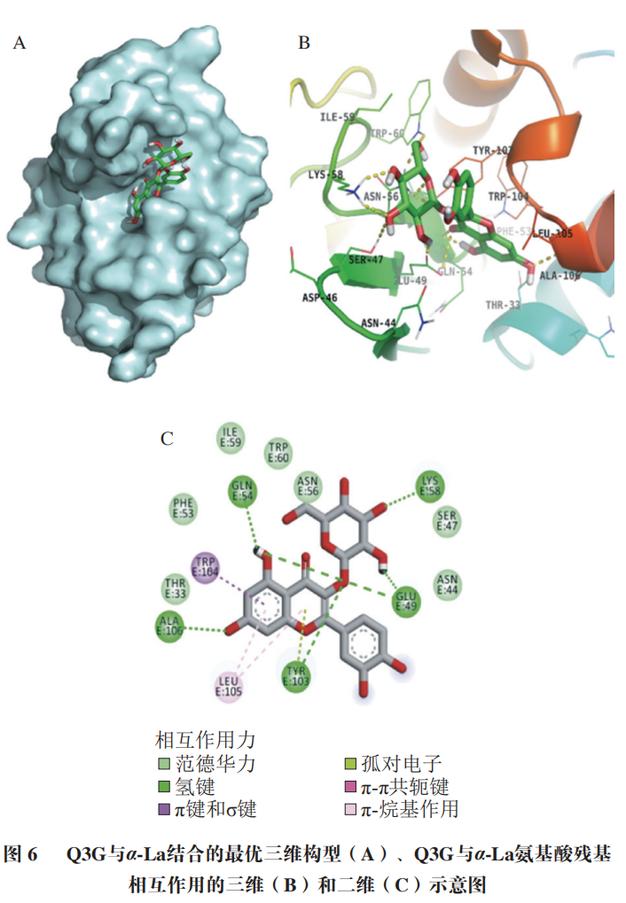 分子对接常用于研究小分子化合物和蛋白的相互作用机制。经过100 次模拟之后,选用结合能量最低(-8.51 kcal/mol)最稳定的模型进行后续的分析(图6A)。从对接结果可以看出,Q3G可进入α-La的疏水口袋中,通过疏水作用力、范德华力和氢键与其氨基酸残基进行结合。由图6B、C可知,Q3G和α-La的氨基酸残基Glu49、Gln54、Lys58、Tyr103、Ala106形成了5 个氢键,与氨基酸残基Thr33、Asn44、Ser47、Phe53、Asn56、Ile59、Trp60形成了范德华力,并和氨基酸残基Trp104、Leu105形成疏水相互作用。Zhang Yuanyuan等也发现Ser-47、Glu-49、Gln-54、Asn-56、Tyr-103、Trp-104、Leu-105、Ala-106、Thr-33等氨基酸残基是α-La的活性位点。研究发现,小分子化合物受氢键、范德华力和疏水相互作用驱动,能自发与蛋白质形成稳定络合物,并影响其构象。因此,Q3G可能是通过与α-La的活性位点结合形成稳定的络合物,影响其空间结构变化,进而影响了果糖与α-La的反应,达到抑制糖基化的早、中和晚期产物形成的效果。