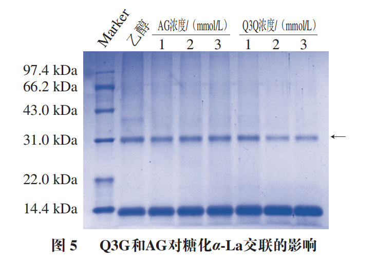 α-La由123 个氨基酸残基组成,分子质量大约为14.2 kDa,糖基化会导致蛋白质交联而使得其分子质量增大如图5所示,控制组在14.4 kDa略下方和31 kDa处各有一明显条带,表明糖基化会引发α-La的交联。添加Q3G之后,31 kDa处蛋白条带与控制组相比明显变浅,当Q3G浓度为2 mmol/L和3 mmol/L时,31 kDa处条带的颜色差异不明显,但显著浅于AG组。以上结果说明Q3G能抑制糖化导致的α-La交联,添加量为2 mmol/L时的抑制效果最好。