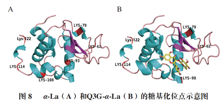 已有研究证明,糖基化位点的增加和减少与黄酮化合物诱导蛋白质Lys残基周围的构象结构和微环境的变化有关。如图8所示,受影响的糖基化位点Lys108、Lys93和Lys98位于Q3G所在的疏水口袋内,说明Q3G可能通过稳定α-La构象并影响Lys残基的微环境,导致α-La的糖基化活性位点减少了一个,达到延缓糖基化进程和减少有害糖基化产物形成的效果。