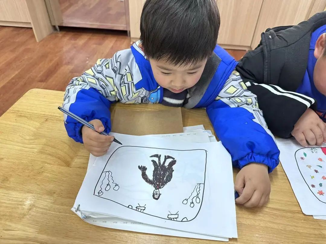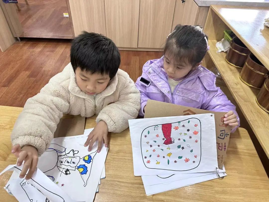 阅读区的小朋友正在绘制自制小书,芷悦正绘声绘色的给她的好朋友讲《服装店的故事》。