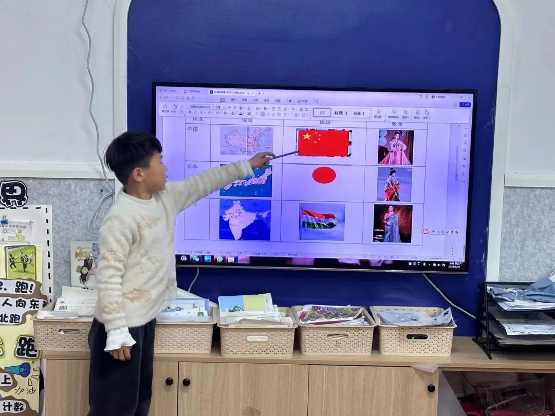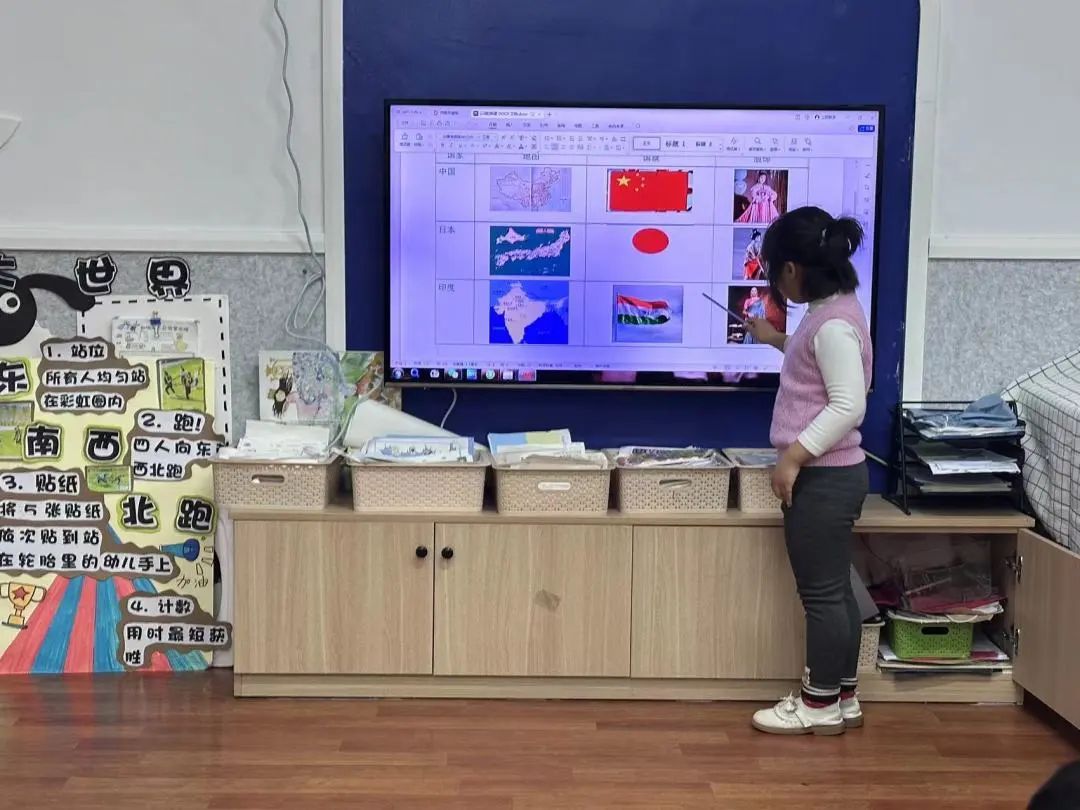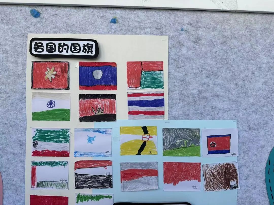 通过亚运会的契机,我们开始走进世界,去了解世界上不同国家的文化和服饰特点。各国国家方队举着国旗走来,当西班牙方队举着国旗走来时,孩子们表现的极为好奇。思炑说:“原来国旗上面还可以再画一个小图案。”胡一凡说:“别的国家都是长方形的形状,还有圆形。”于是,关于各国国旗的探索就此开始。