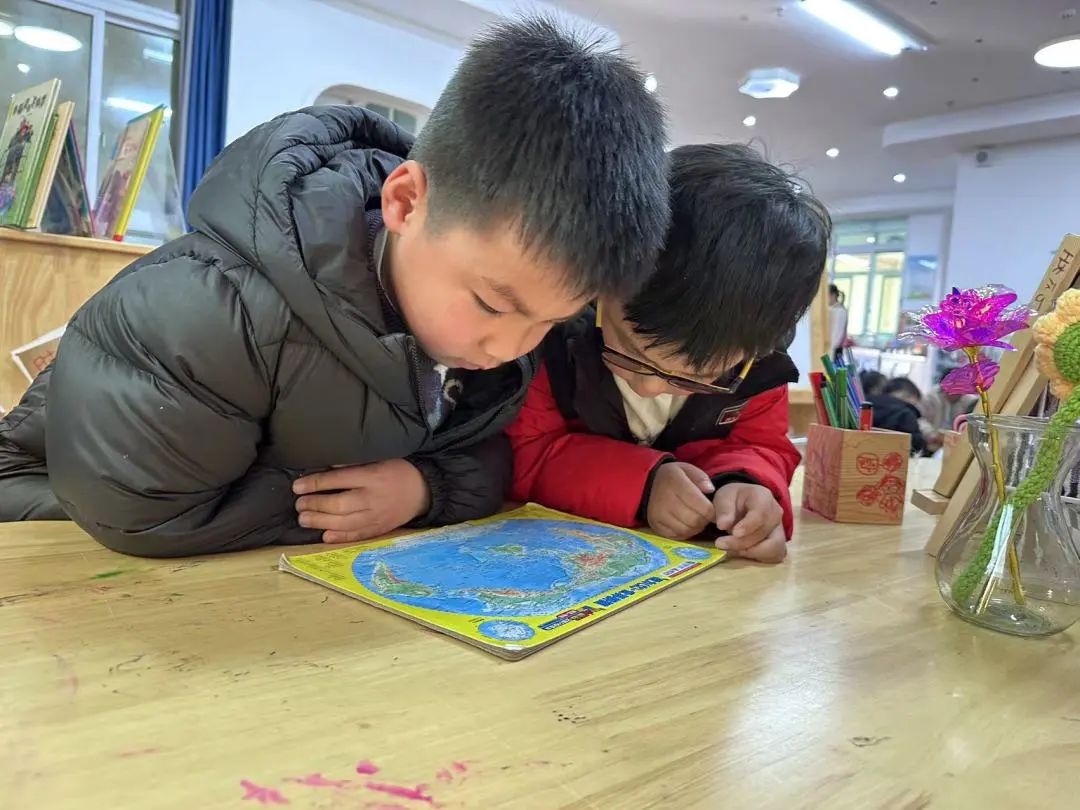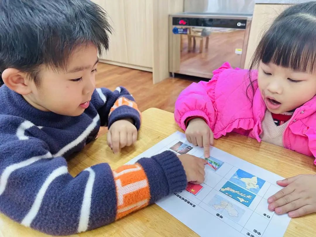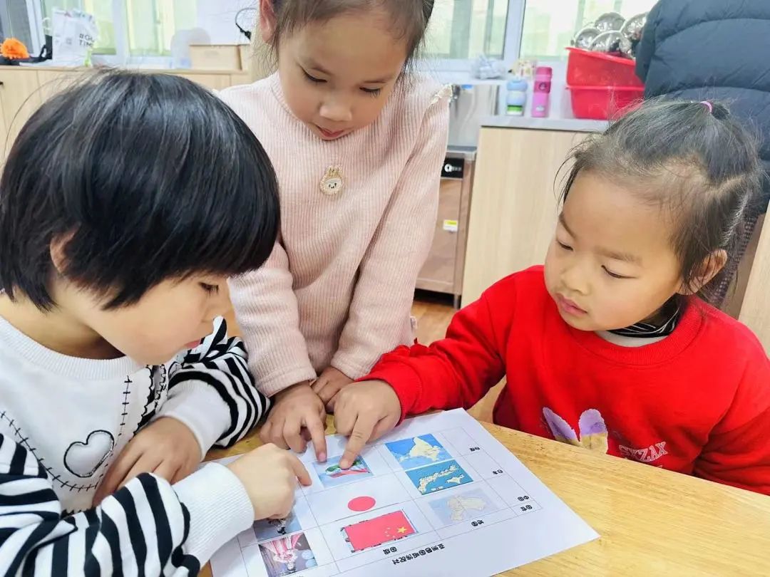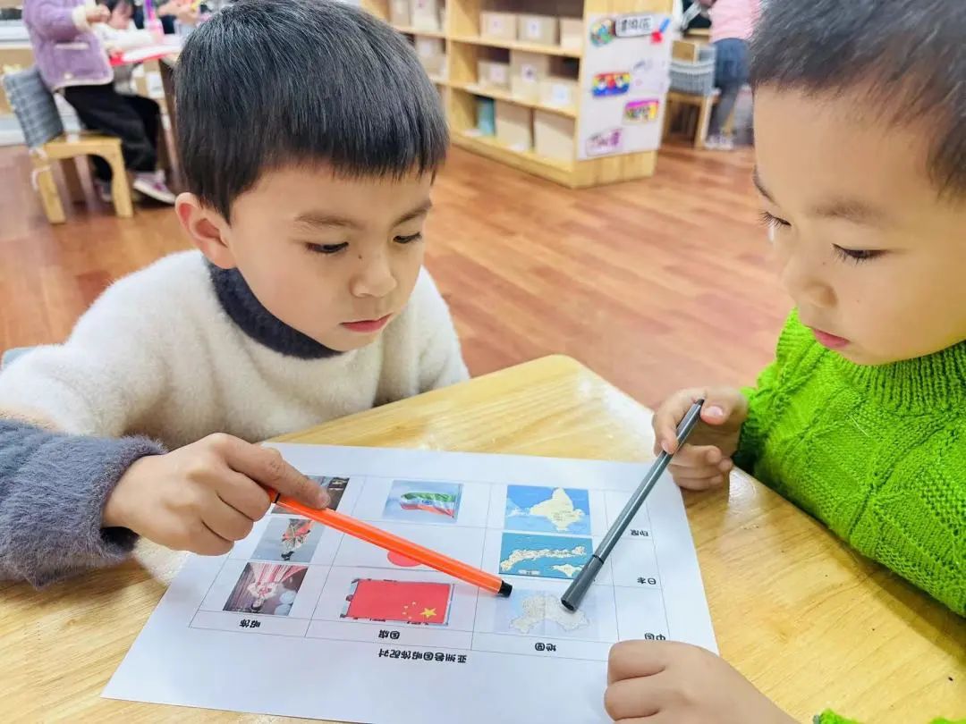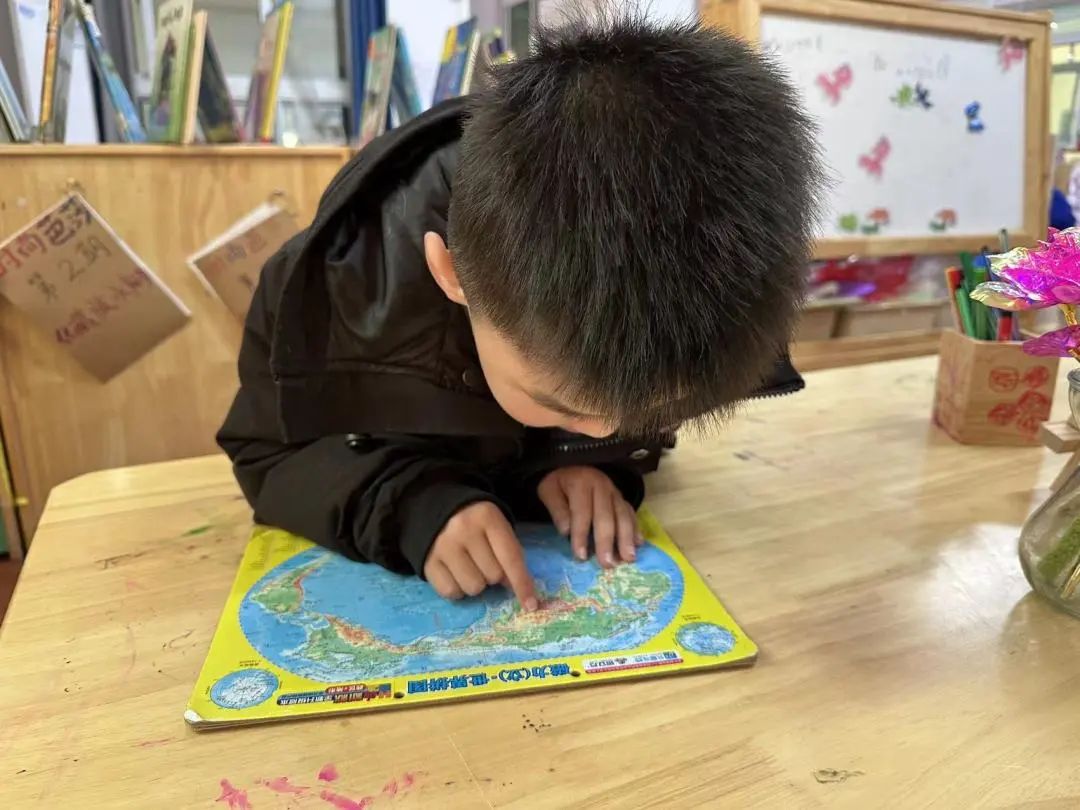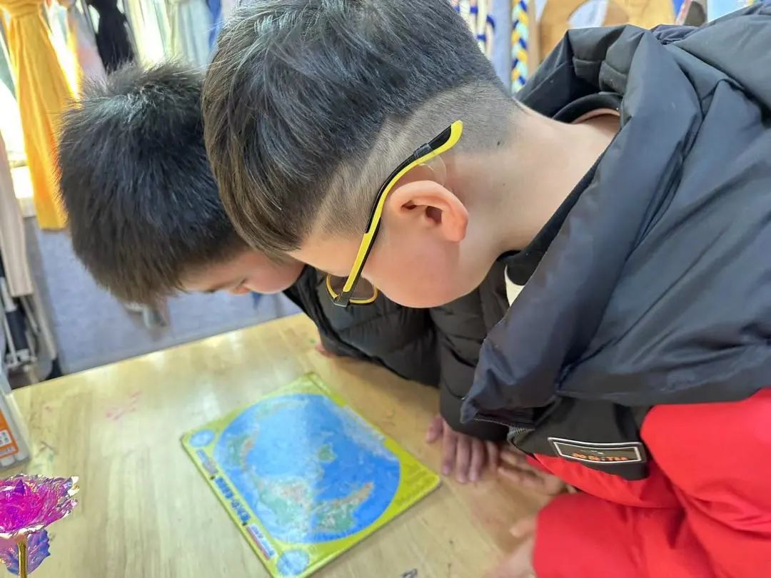 认识世界上各种国家的服饰,首先要对地球上的国家做深刻认识。看!孩子们在研究世界地图呢。在地图上,孩子们发现每个国家的面积和形状都是不一样的。